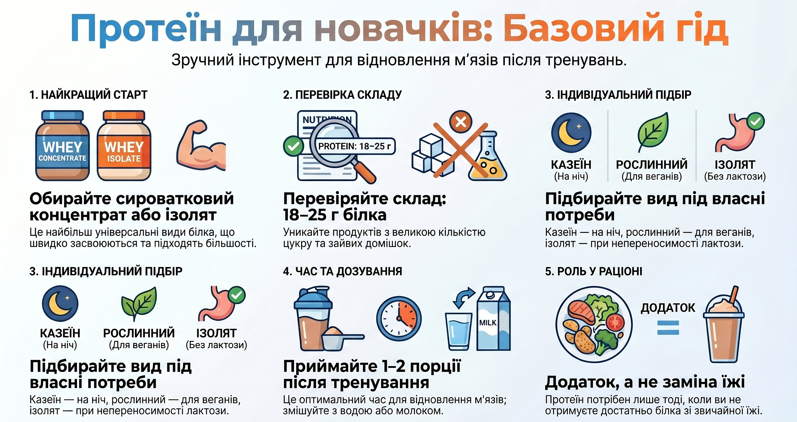 При виборі білкової добавки важливо орієнтуватися не на маркетингові обіцянки і яскраву упаковку, а на склад і власні цілі. Наведемо практичні рекомендації, як вибрати протеїн для початківців: