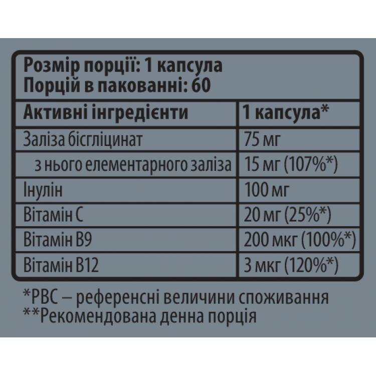 Інгредієнти: інулін, заліза бісгліцинат, вітамін С (аскорбінова кислота),