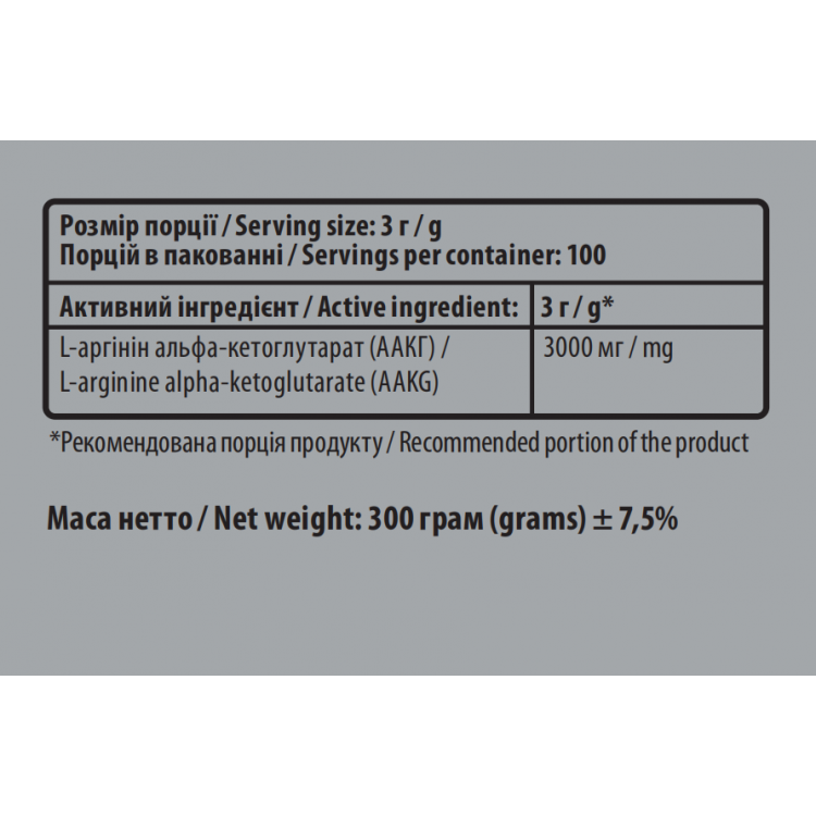 - L-аргінін альфа-кетоглутарат (AAKG) - 300 г в упаковці