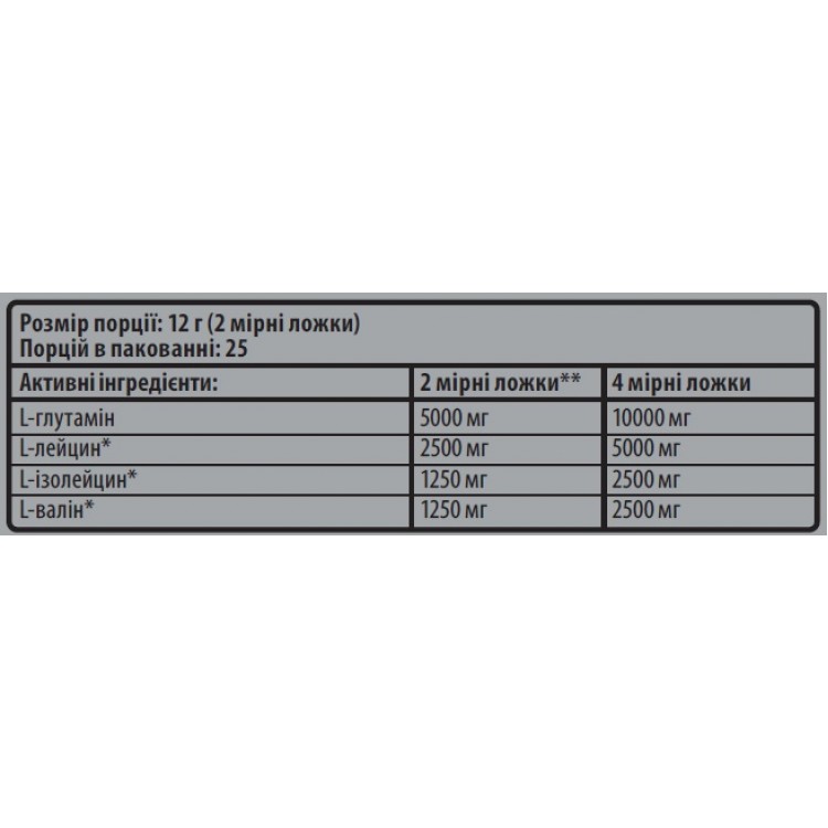 Кожна порція (12 г) забезпечує оптимальне співвідношення амінокислот для підтримки м'язового росту та відновлення. Упаковка містить 300 г продукту, що складає 25 порцій.