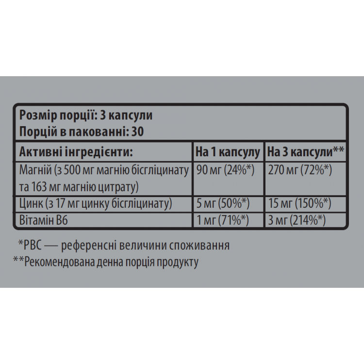 | Тип продукту | ZMA (Цинк + Магній + Вітамін В6) |