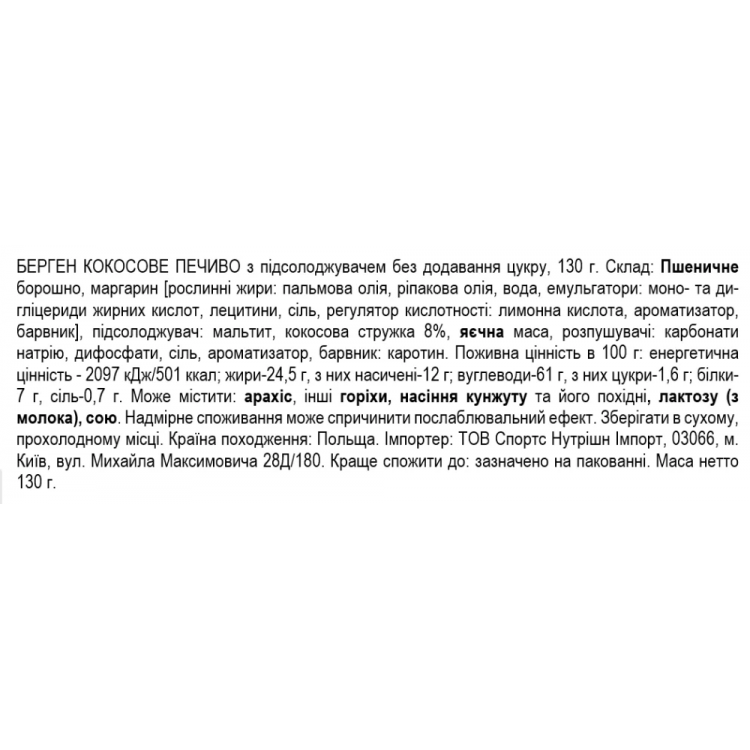 Кокосове печиво Bergen виготовлене з натуральних інгредієнтів, які забезпечують не тільки чудовий смак, а й корисні властивості: