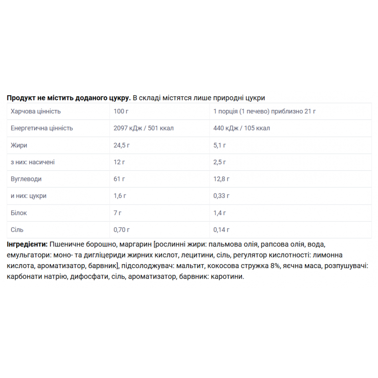 Вміст білка у складі кокосового печива допомагає підтримувати м'язову масу і сприяє швидкому відновленню після фізичних навантажень. Безцукрова формула дозволяє уникнути різких стрибків рівня глюкози в крові, що особливо важливо для тих, хто контролює свою дієту.