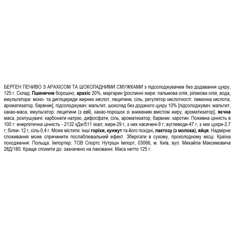Печиво Bergen з арахісом та шоколадними смужками (без цукру) - це не просто смачний десерт, а й корисний перекус для активних людей. Замовте його вже сьогодні в нашому інтернет-магазині та насолоджуйтесь якісним продуктом без шкоди для здоров'я!