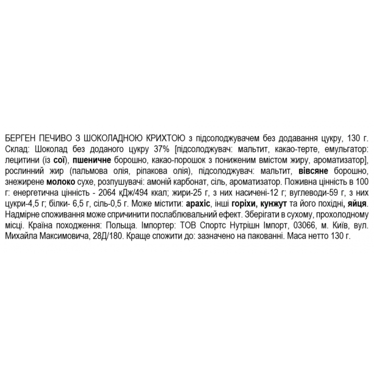 Печиво Bergen з шоколадною крихтою (без цукру) - це смачний та корисний перекус, який подарує вам енергію та насолоду без зайвих калорій. Не втрачайте можливість поласувати цією смакотою! Купуйте печиво Bergen в нашому інтернет-магазині вже сьогодні!