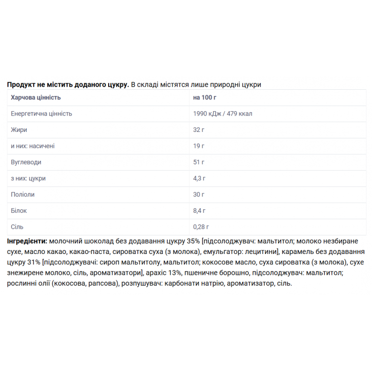 - Смачна комбінація молочного шоколаду та карамелі — чудовий смак без шкоди для фігури.