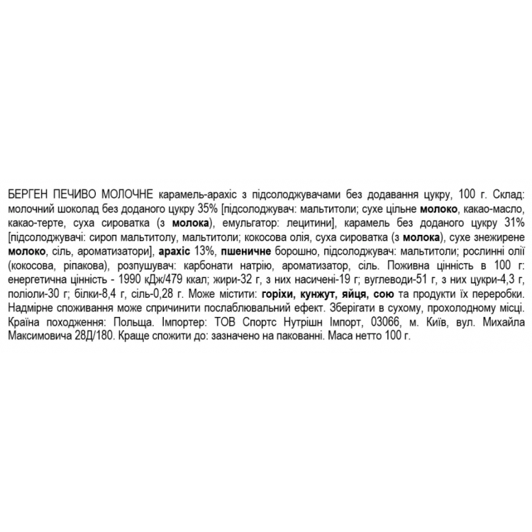 Печиво Bergen молочне карамель-арахіс (без цукру) — це відмінний вибір для всіх, хто прагне поєднати смачний смак з користю для організму. Не пропустіть можливість придбати цей продукт в нашому інтернет-магазині вже сьогодні!