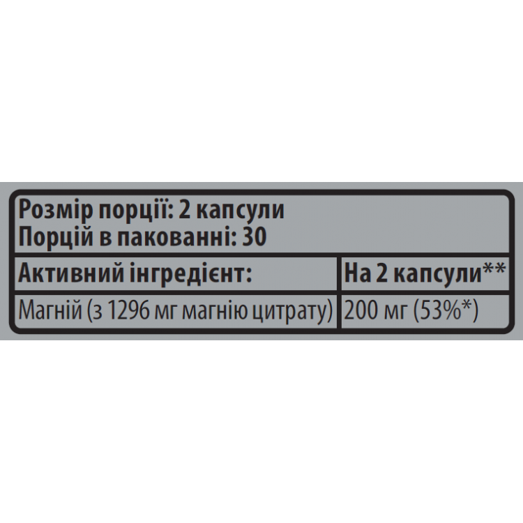 Кожна капсула містить 100 мг магній цитрату, що є ідеальним джерелом цього важливого мінералу. Упаковка містить 60 капсул, що забезпечує вам достатньо порцій на місяць (30 порцій).