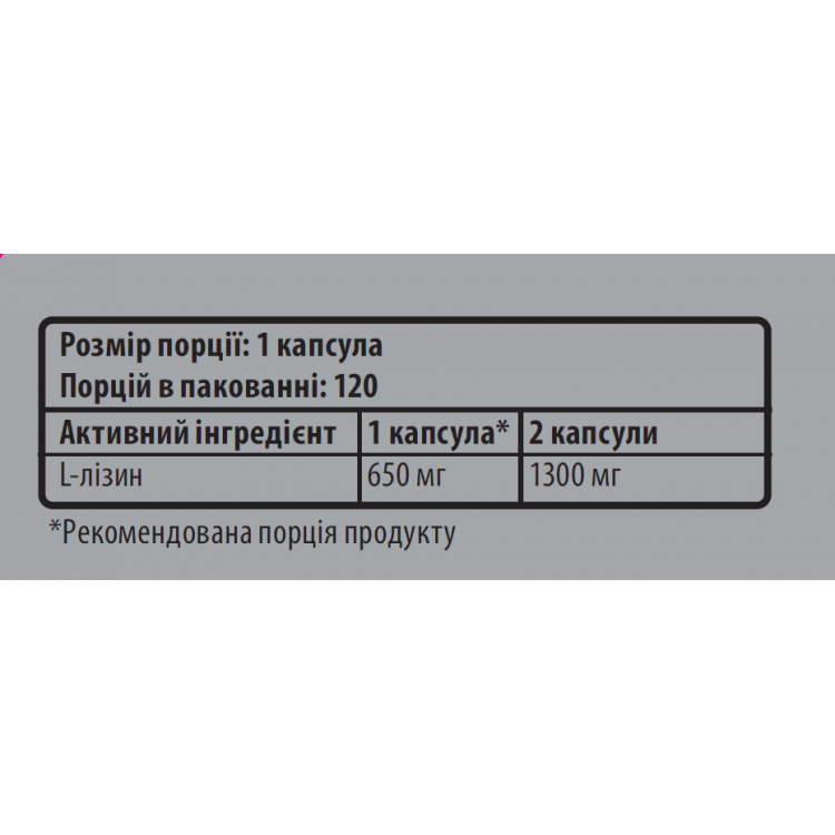 - Высокая концентрация: 650 мг лизина в каждой капсуле.