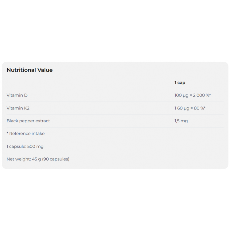 Витамин D3 отвечает за регуляцию обмена кальция и фосфора в организме, что способствует укреплению костной ткани. Витамин K2 обеспечивает правильное распределение кальция в организме, предотвращая его отложение в мягких тканях и артериях. Благодаря этому сочетанию вы получаете двойную защиту для своих костей.