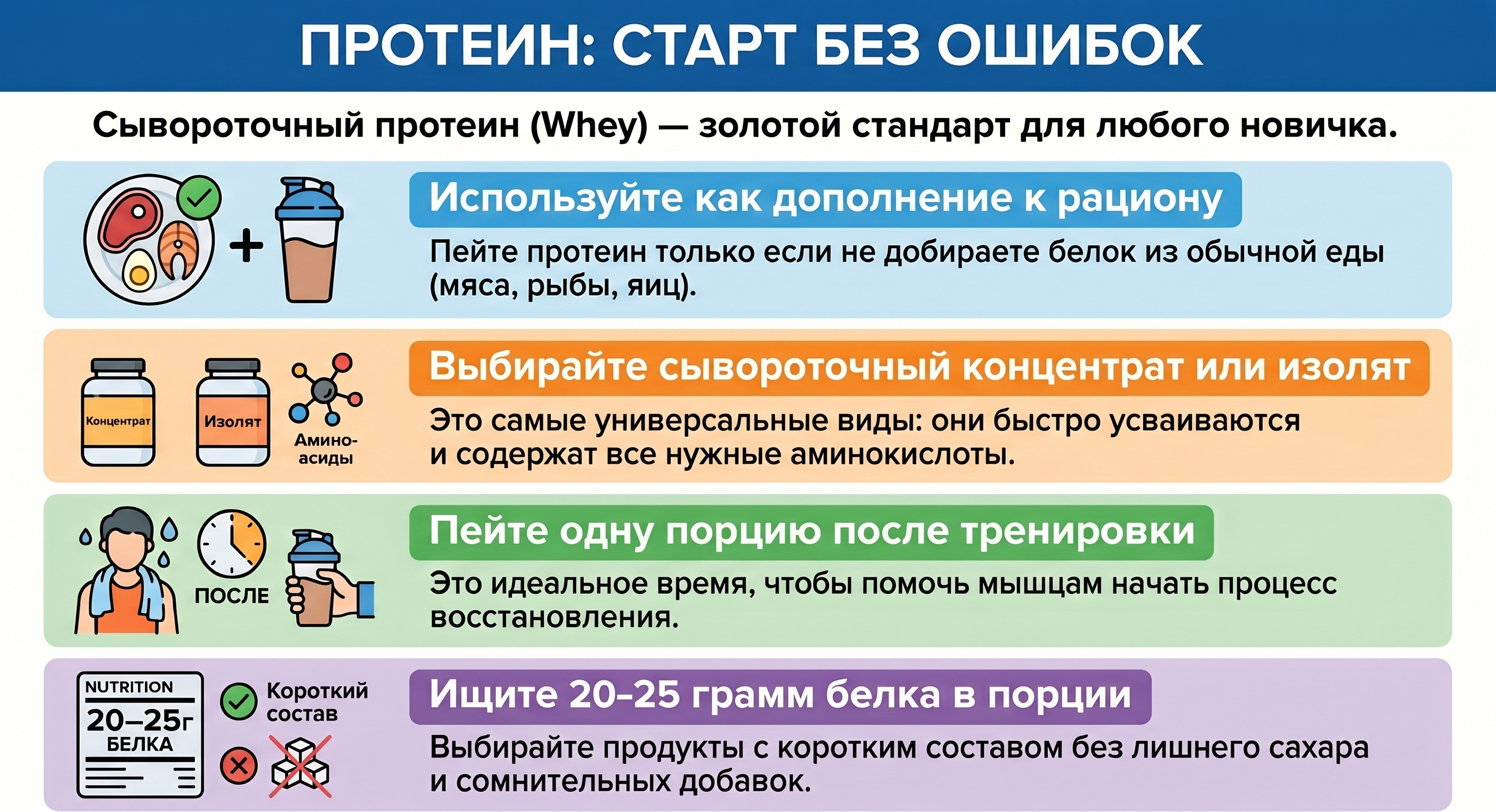 Вывод: протеин — это удобная добавка для дополнения рациона, но основой результата остаются тренировки, сбалансированное питание и восстановление.